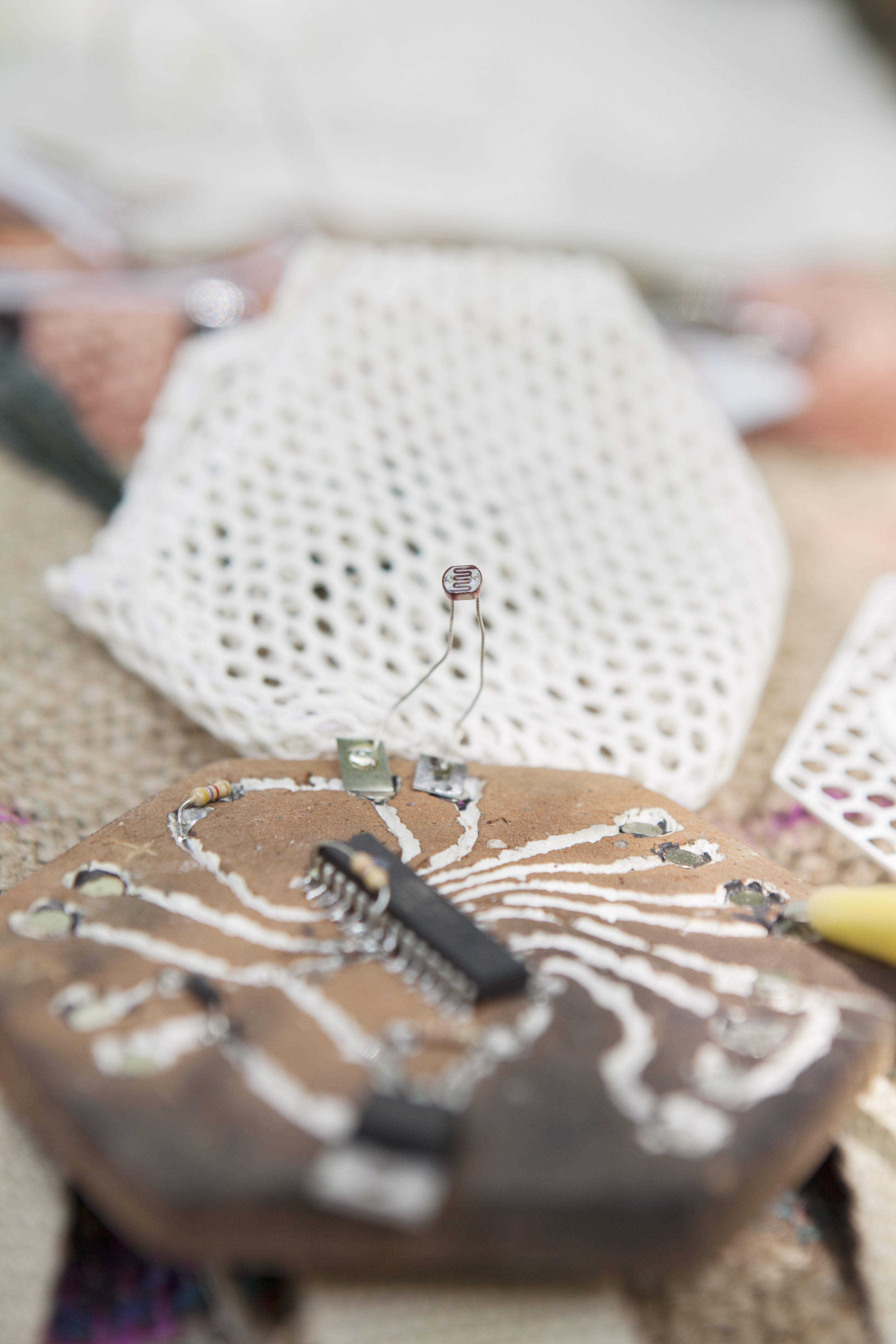 It is an open secret that the hardware in our smart devices contains not only plastics but also conflict minerals such as tungsten, tin, tantalum, silver and gold. The Clay PCB Investigates alternative hardware from locally sourced materials, so-called ethical hardware, to develop and speculate upon renewable practices for the benefit of both nature and humans. We explored different materials, sentient, low-impact, non-toxic, fair traded, recycled and urban mined means of production. The Clay PCB challenges the common PCB (printed circuit board) economies in an artistic, creative, positive and responsible way applying feminist hacking as an artistic methodology and critical framework. The Clay PCB is a PCB board made of natural clay, collected in Burgenland (At) and fired according to ancient craft techniques in a open wood fire. The conductive tracks of the circuit use recycled silver and all the components are recycled from old electronics. The PCB works as a pre-programmed microcontroller (such as the Arduino) prepared to connect several input sensors (analog and digital) and outputs such as leds, piezo and DC motors (up to 12Volt).